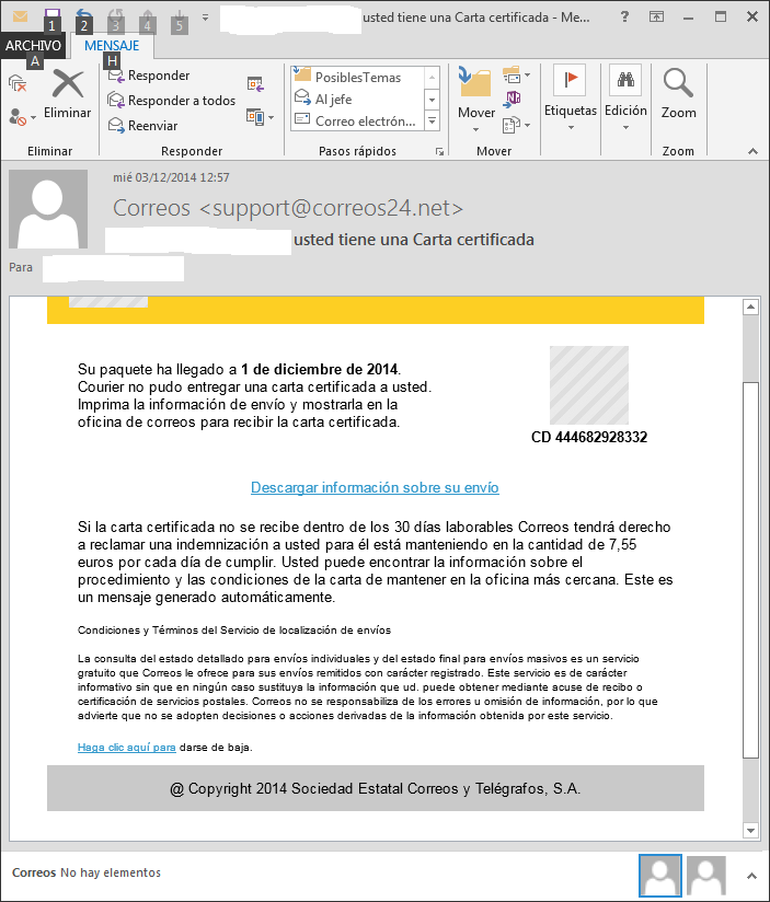 Se están recibiendo una gran cantidad de correos fraudulentos de tipo phishing que se hacen pasar por la compañía Correos para instalar un virus que cifrará los archivos de los usuarios que caigan en la trampa dejando inutilizado el ordenador afectado.