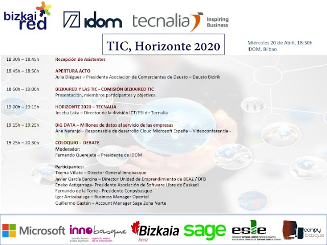 El pasado miércoles día 20 a las 18:30h Bizkaired organizó en las instalaciones de IDOM: "TIC AL ALCANCE DE TODAS LAS EMPRESAS, HORIZONTE 2020", contando con la colaboración de agentes muy importantes y relevantes en esta materia: SPRI, Innobasque, ESLE, Conpybasque, Microsoft y Sage.